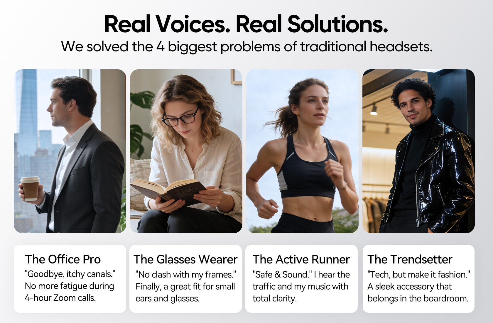 To us, life without a soundtrack is just silence. We wanted a background score for every second of our lives. But we hit a wall: traditional headphones were "digital cages"—bulky and outdated. In-ears felt like earplugs, and ear-hooks (OWS) felt like heavy equipment that pressed painfully on the cartilage. We searched for a headphone that could simply "vanish" in comfort. When we couldn't find it, we built it.